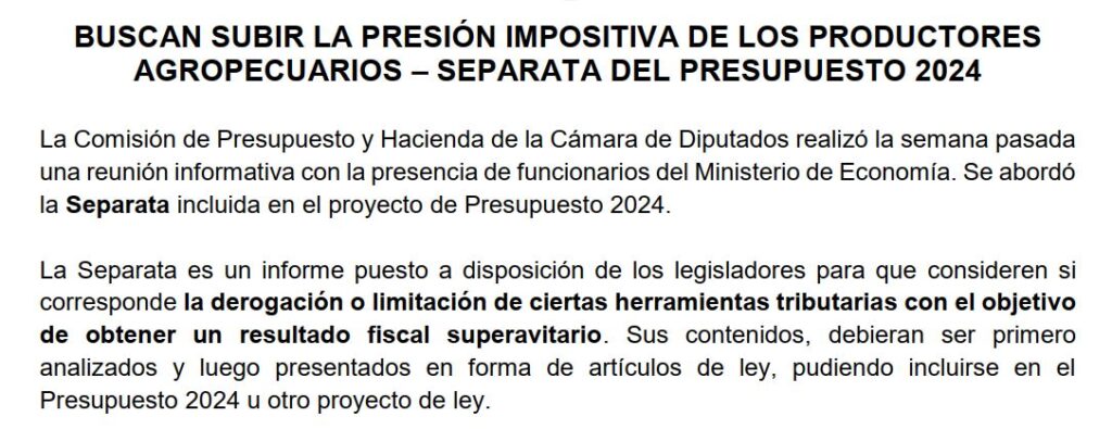 BUSCAN SUBIR LA PRESIÓN IMPOSITIVA DE LOS PRODUCTORES AGROPECUARIOS – SEPARATA DEL PRESUPUESTO 2024 La Comisión de Presupuesto y Hacienda de la Cámara de Diputados realizó la semana pasada una reunión informativa con la presencia de funcionarios del Ministerio de Economía. Se abordó la Separata incluida en el proyecto de Presupuesto 2024. La Separata es […]