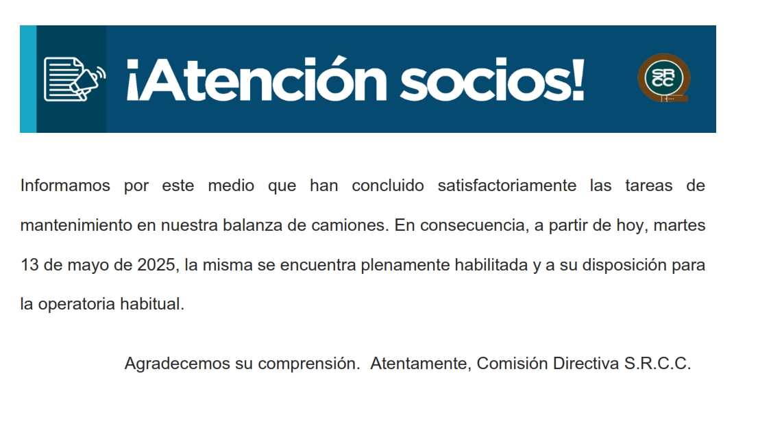 Informamos por este medio que han concluido satisfactoriamente las tareas de mantenimiento en nuestra balanza de camiones. En consecuencia, a partir de hoy, martes 13 de mayo de 2025, la misma se encuentra plenamente habilitada y a su disposición para la operatoria habitual.